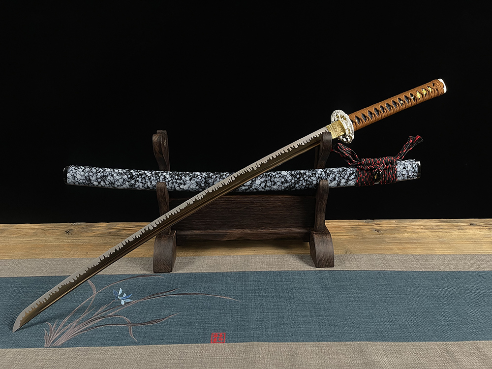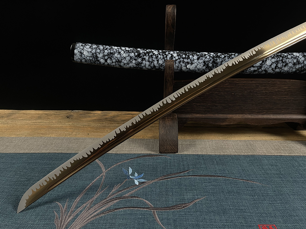 【规格】 全长:103cm左右,柄长:26cm,刃长:72cm,刃宽:3.2cm,刃厚:0.7cm 刀刃: 高碳钢 全槽 烤金 刀纹 刀鞘: 木质+白纹黑底艺术大漆 手柄: 木质+棕色真丝带+黑真鱼皮+金色龙片 下绪: 双色粗真丝带 配件: 合金装置+铜制花夹+铜垫片 其他事项:手工产品,重量尺寸稍有误差,请以实物为准