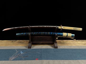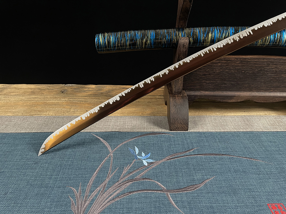【规格】 全长:103cm左右,柄长:26cm,刃长:72cm,刃宽:3.2cm,刃厚:0.7cm 刀刃: 高碳钢 4面 烤金 刀纹 刀鞘: 木质+3色双色艺术大漆 手柄: 木质+金色真丝带+黄色真鱼皮+青古铜色 龙片 下绪: 米黄中粗真丝带 配件: 合金装置+铜制花夹+铜垫片 其他事项:手工产品,重量尺寸稍有误差,请以实物为准