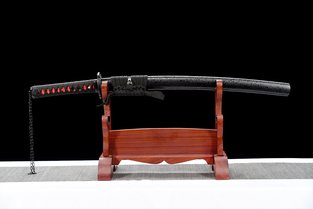 【规格】 全长:78cm左右,柄长:23cm,刃长:52cm,刃宽:3.2cm,刃厚:0.7cm 刀刃: 高碳钢 全槽 切线 发黑 刀鞘: 木质+黑色哑光点漆 手柄: 木质+咖啡真丝带+红色真鱼皮+黑色龙片 下绪: 咖啡色真丝带 配件: 合金装置+铜制花夹+铜垫片 其他事项:手工产品,重量尺寸稍有误差,请以实物为准