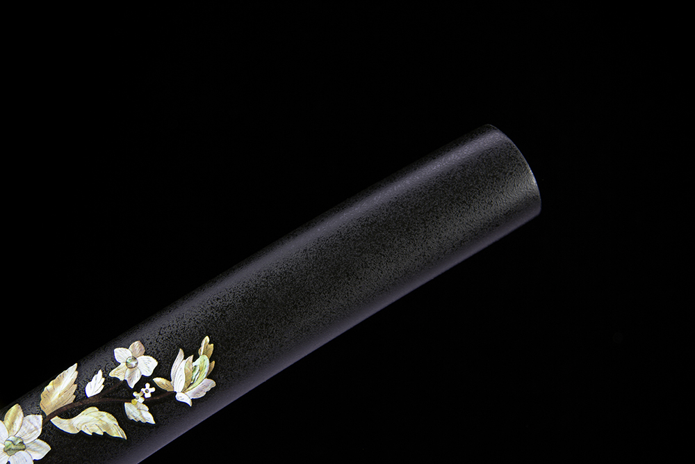 【规格】 全长:103cm左右,柄长:26cm,刃长:72cm,刃宽:3.2cm,刃厚:0.7cm 刀刃: 碳钢 烧刃 手工磨 刀鞘: 木质+黑色点漆 手柄: 木质+黑色真丝带+黑色真鱼皮+金色龙片 下绪: 黑色中粗真丝带 配件: 铁刀盘+铜垫片+铜制花夹 【其他事项】 手工产品,重量尺寸稍有误差,请以实物为准