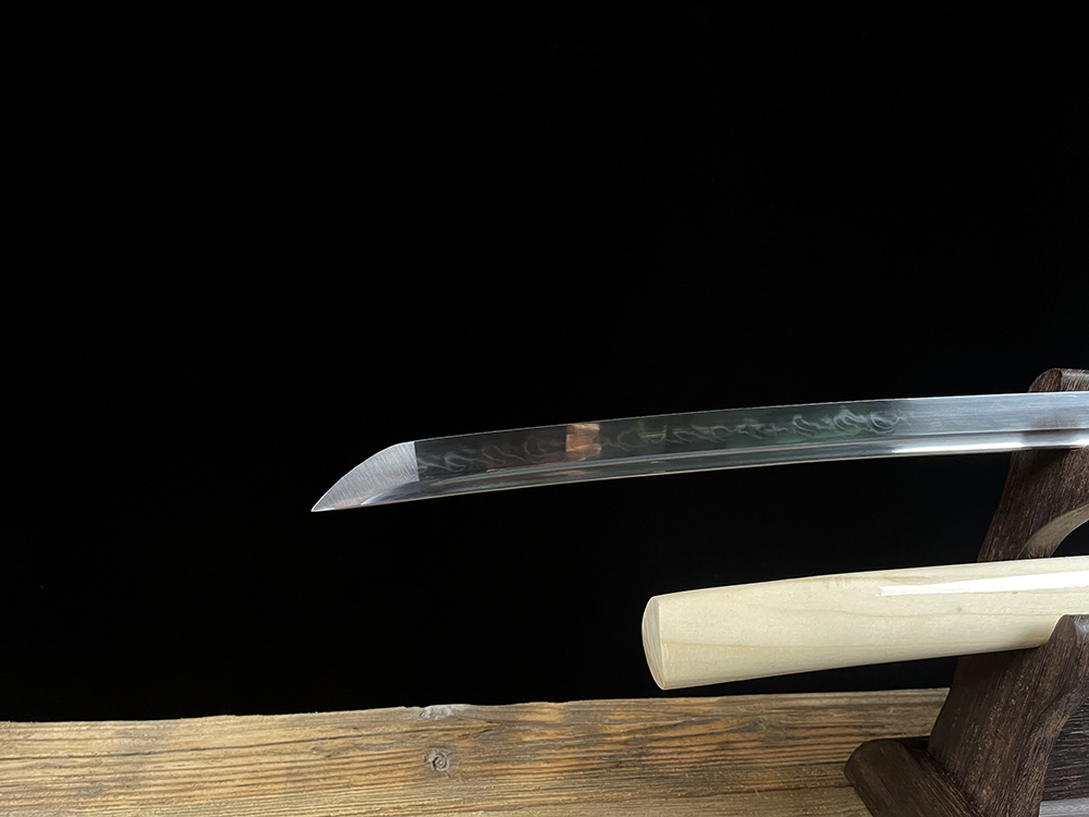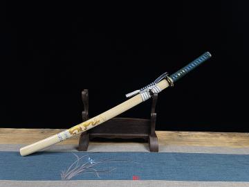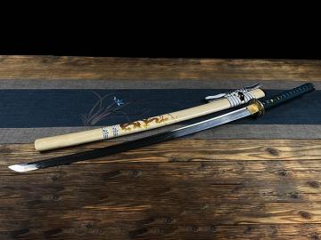 【规格】 全长:103cm左右,柄长:26cm,刃长:72cm,刃宽:3.2cm,刃厚:0.7cm 刀刃: T10 烧刃 手工磨 刀鞘: 木质+贴花本色漆 手柄: 木质+深蓝真丝带+蓝色真鱼皮+铜龙片 下绪: 双色粗真丝带 配件: 铜装做旧+铜垫片+铜制刀夹 其他事项:手工产品,重量尺寸稍有误差,请以实物为准