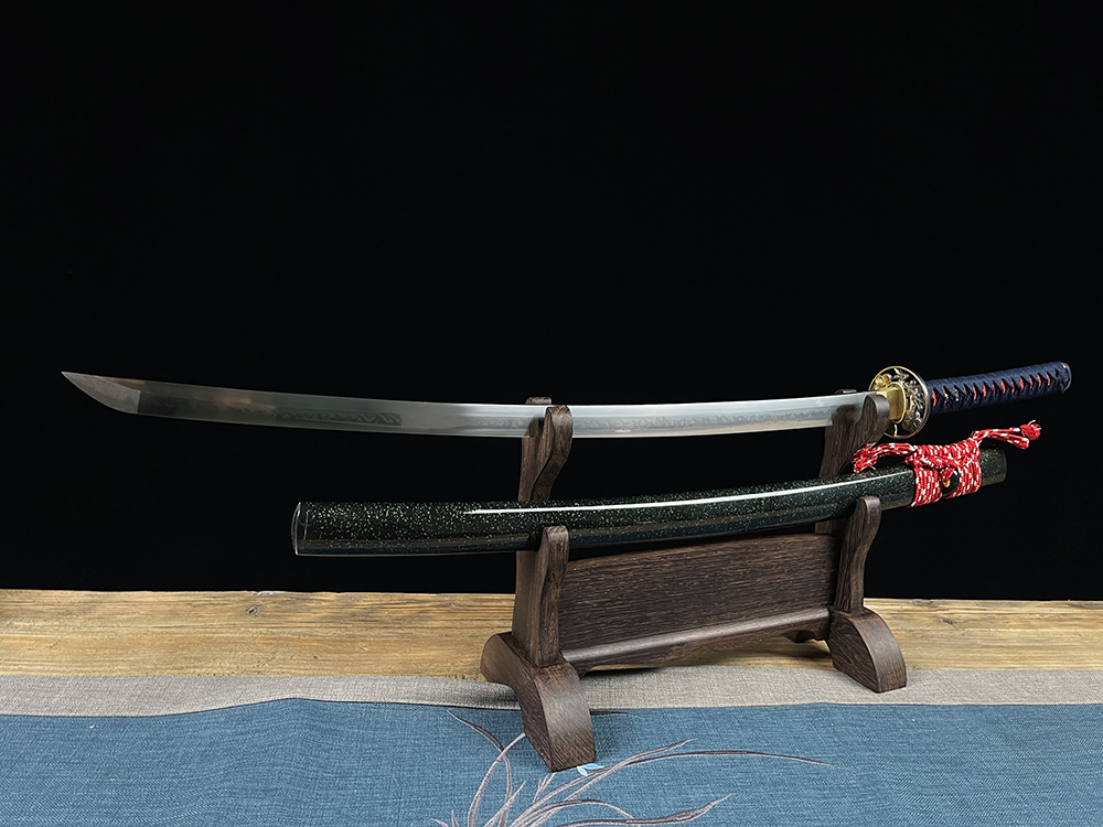 【规格】 全长:103cm左右,柄长:26cm,刃长:72cm,刃宽:3.2cm,刃厚:0.7cm 刀刃: T10 烧刃 手工磨 刀鞘: 木质+高级艺术点漆 手柄: 木质+深蓝真丝带+红色真鱼皮+铜龙片 下绪: 双色粗真丝带 配件: 铜装做旧+铜垫片+铜制花夹 其他事项:手工产品,重量尺寸稍有误差,请以实物为准