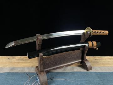 【规格】 全长:78cm左右,柄长:23cm,刃长:52cm,刃宽:3.2cm,刃厚:0.7cm 刀刃: 高碳钢 全槽 切线 刀鞘: 木质+黑亮漆 手柄: 木质+棕色真丝带+黑色仿鱼皮+龙片 下绪: 棕色真丝带 配件: 合金装置 其他事项:手工产品,重量尺寸稍有误差,请以实物为准