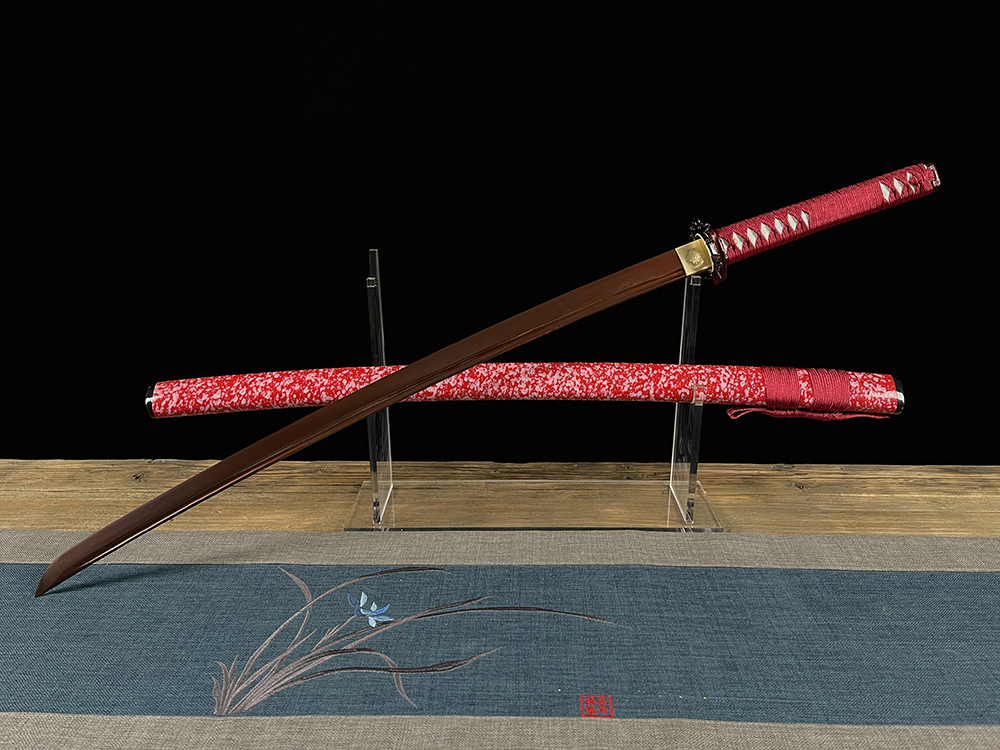 【规格】 全长:103cm左右,柄长:26cm,刃长:72cm,刃宽:3.2cm,刃厚:0.7cm 刀刃: 高碳钢 全槽 刀鞘: 木质+白花点 红色亮漆 手柄: 木质+红色真丝带+仿白鱼皮 下绪: 红色真丝带 配件: 合金装置+铜制花夹+铜垫片 其他事项:手工产品,重量尺寸稍有误差,请以实物为准