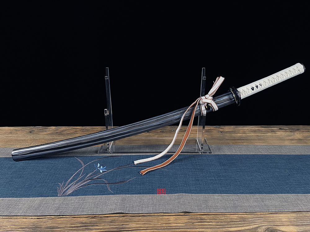 【规格】 全长:103cm左右,柄长:26cm,刃长:72cm,刃宽:3.2cm,刃厚:0.7cm 刀刃:花纹钢 全槽 烤金 双线手磨刀纹 刀鞘: 木+双色艺术大漆 手柄: 木制+白色真丝带+白色仿鱼皮+龙片 下绪: 双色粗真丝带 配件: 合金装具+铁刀镡+铜制花夹+铜垫片 【其他事项】 手工产品,重量尺寸稍有误差,请以实物为准