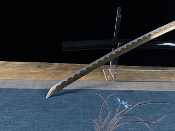 【规格】 全长:103cm左右,柄长:26cm,刃长:72cm,刃宽:3.2cm,刃厚:0.7cm 刀刃: 花纹钢 4面 烤金 手磨双线刀纹 刀鞘: 木质+双区艺术大漆 手柄: 木质+咖啡色真丝带+黑色仿鱼皮+铜龙片 下绪: 双色粗真丝带 配件: 全铜做旧装具+铜制花夹+铜垫片 其他事项:手工产品,重量尺寸稍有误差,请以实物为准