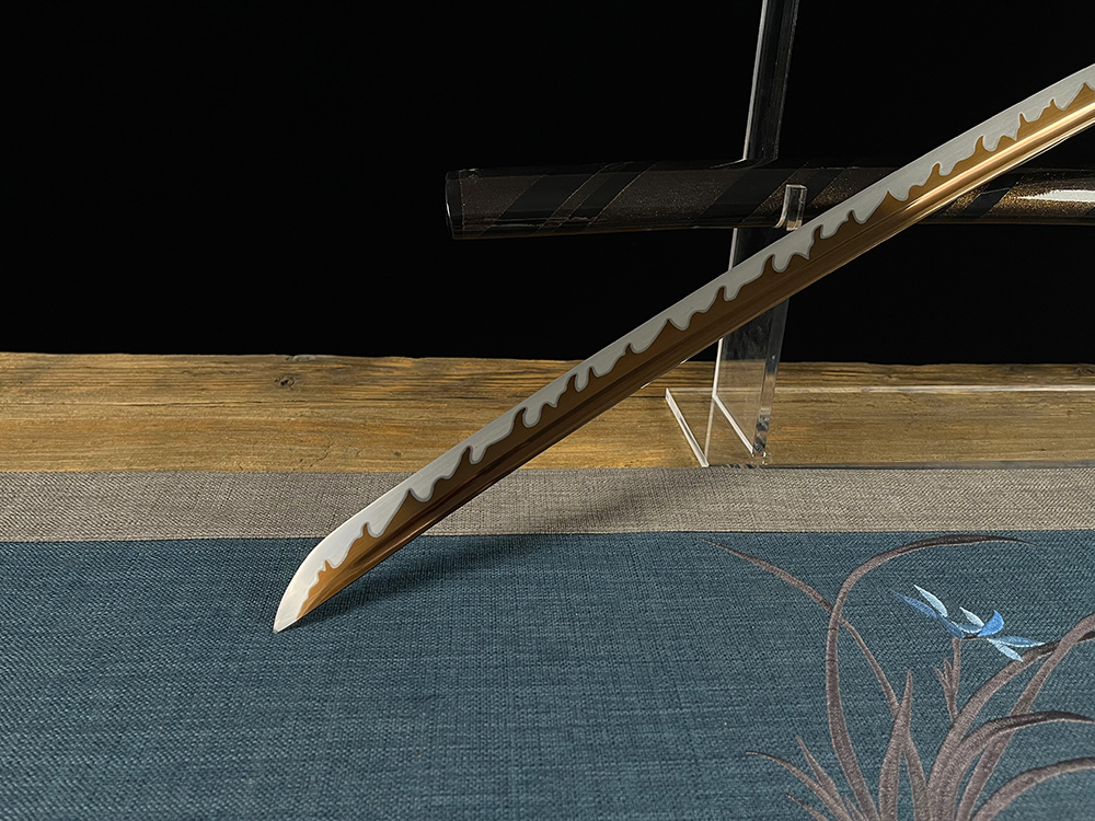 【规格】 全长:103cm左右,柄长:26cm,刃长:72cm,刃宽:3.2cm,刃厚:0.7cm 刀刃: 高碳钢 全槽 烤金 双线手磨刀纹 刀鞘: 木质+2色艺术大漆 手柄: 木质+咖啡色仿皮带+白色仿鱼皮+龙片 下绪: 双色粗真丝带 配件: 合金装置+铜制花夹+铜垫片 其他事项:手工产品,重量尺寸稍有误差,请以实物为准
