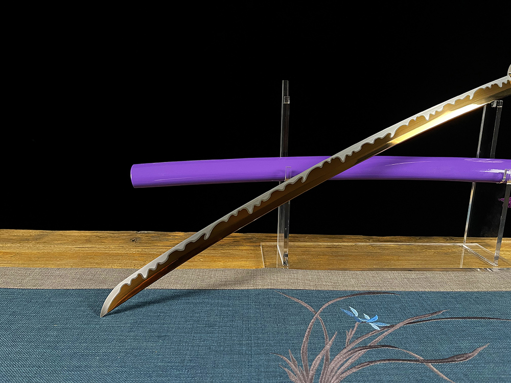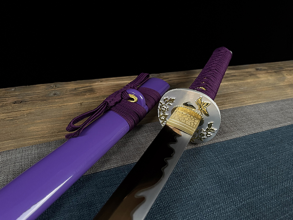 【规格】 全长:103cm左右,柄长:26cm,刃长:72cm,刃宽:3.2cm,刃厚:0.7cm 刀刃: 高碳钢 4面 烤金 双线手磨刀纹 刀鞘: 木质+紫色大漆 手柄: 木质+紫色真丝带+白色仿鱼皮+龙片 下绪: 紫色真丝带 配件: 合金装置+铜制花夹+铜垫片 其他事项:手工产品,重量尺寸稍有误差,请以实物为准