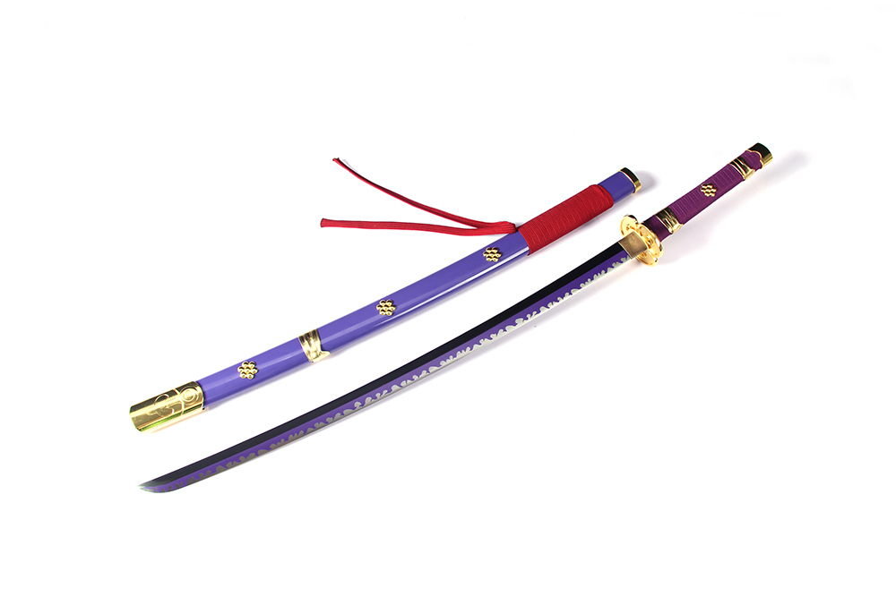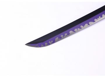 【规格】 全长:103cm左右,柄长:26cm,刃长:72cm,刃宽:3.2cm,刃厚:0.7cm 刀刃: 碳钢4面+漆纹处理 刀鞘: 木质+紫色亮漆+合金上下节+金色皮圈 手柄: 木质+紫色真丝带+金色皮圈 配件: 合金装置+合金梅花+铜制刀夹; 下绪: 红色真丝带 其他事项:手工产品,重量尺寸稍有误差,请以实物为准