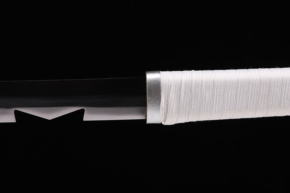 【规格】 全长:103cm左右,柄长:26cm,刃长:72cm,刃宽:3.2cm,刃厚:0.7cm 刀刃: 齿状碳钢刀条+发黑色+直纹 刀鞘: 白色皮套+白色背带 手柄: 木质+白色真丝带 配件: 合金装置+黑色合金刀夹 其他事项: 手工产品,重量尺寸稍有误差,请以实物为准