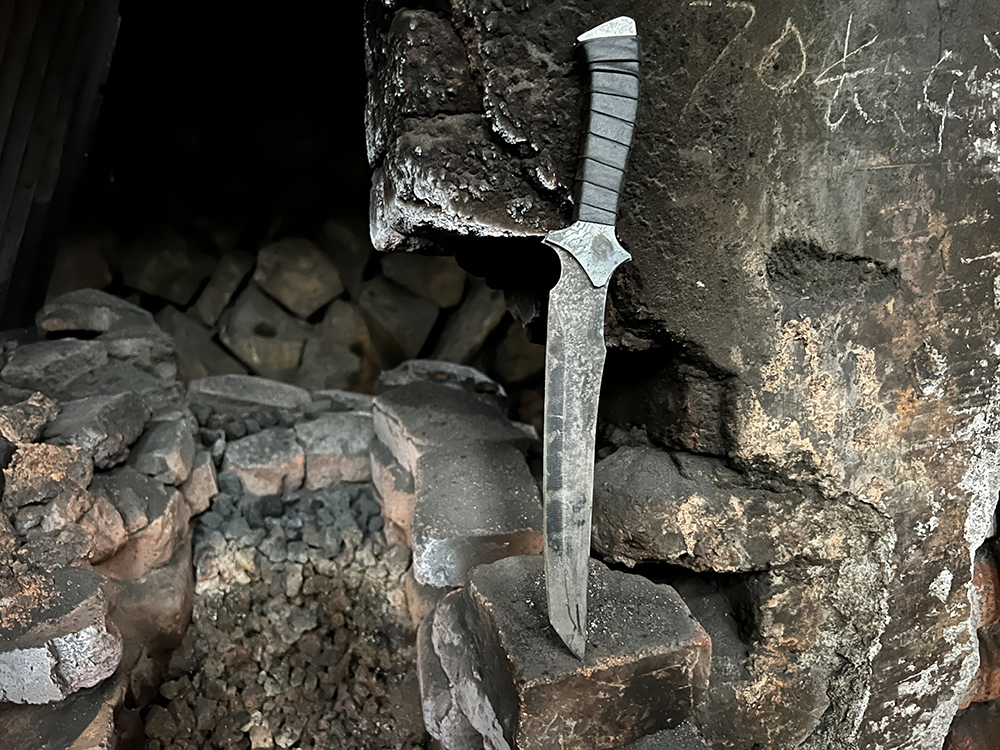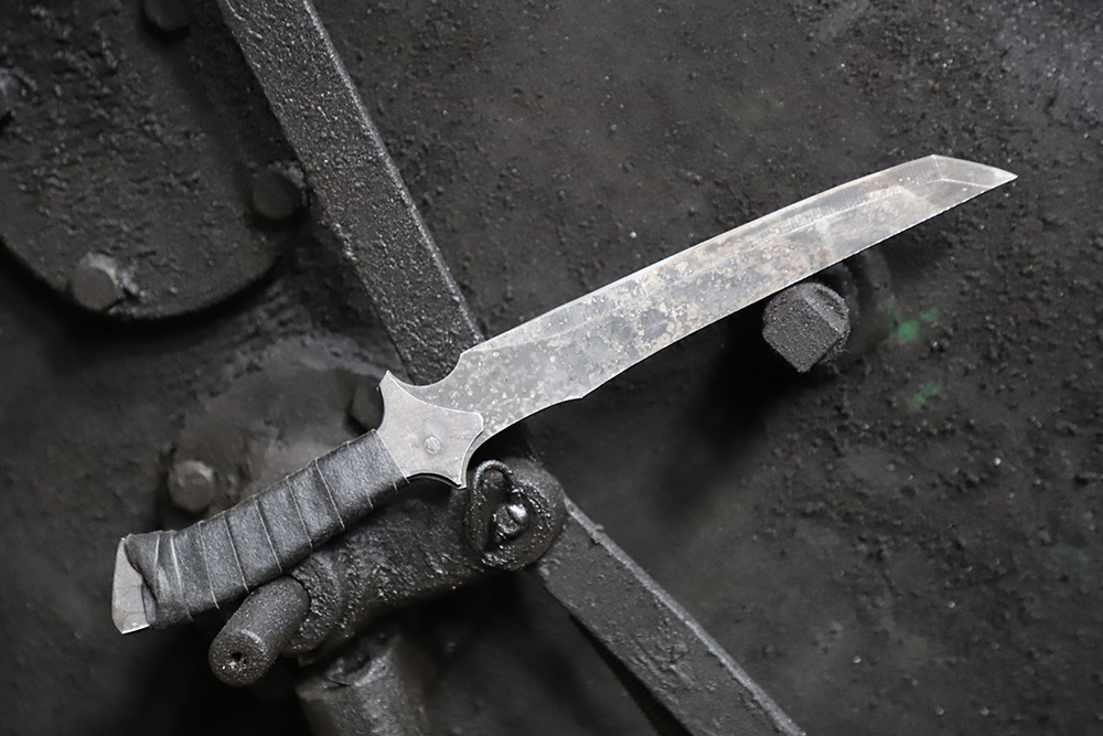 【规格】 全长:35cm, 刃长20.5cm ,刃厚0.5cm ,柄长11.5cm ,刃宽0.33cm ,鞘长26.5cm,含鞘0.54kg ,净重0.47kg,65Mn钢手工打造,古法热处理,仿皮绳,仿皮套 其他事项: 手工产品,重量尺寸稍有误差,请以实物为准