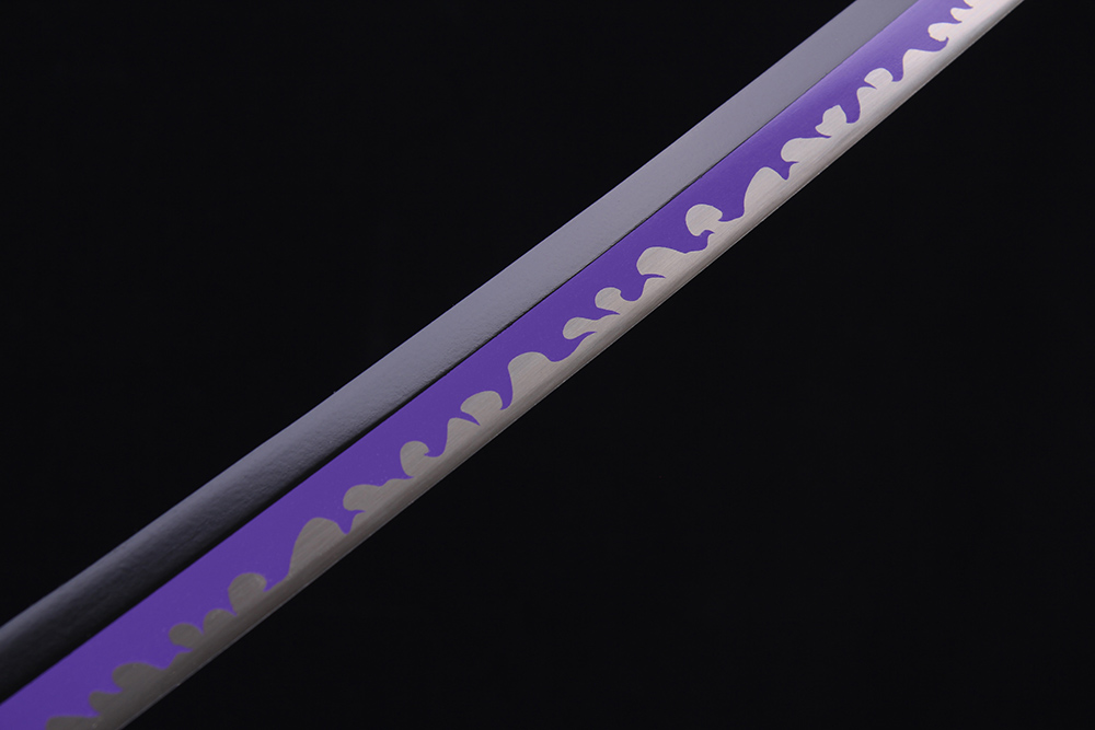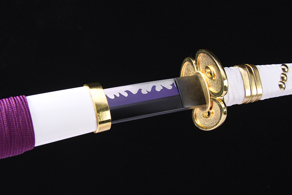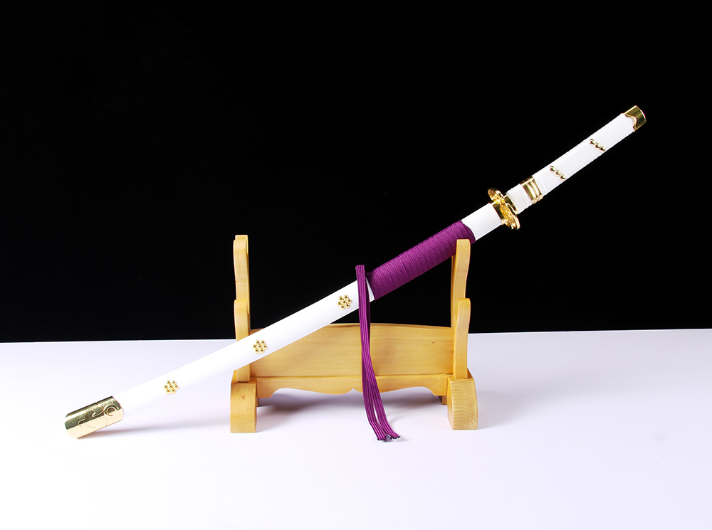 【规格】 全长:103cm左右,柄长:26cm,刃长:72cm,刃宽:3.2cm,刃厚:0.7cm 刀刃: 碳钢4面+漆纹处理 刀鞘: 木质+白色亮漆+合金上下节+金色皮圈 手柄: 木质+紫色真丝带+金色皮圈 配件: 合金装置+合金梅花+铜制刀夹; 下绪: 红色真丝带 其他事项:手工产品,重量尺寸稍有误差,请以实物为准
